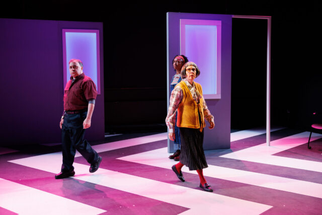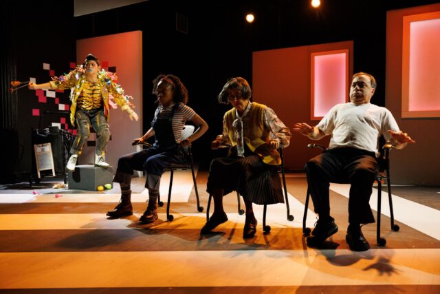 Anna Kiraly’s set consists of rolling chairs, doorways with windows on which she projects different color schemes, a mazelike path on the floor, and a corner with special props for Calliope. Olivera Gajic’s costumes feature Frankie in a quaint sweater and skirt, Danny in a white T-shirt and sneakers, Norma in blue-jean overalls and wearing a red bandanna, and Calliope in a series of wildly adorned outfits.