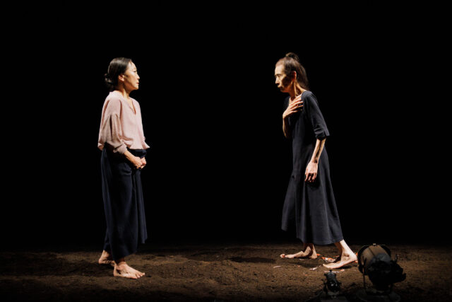 The two women then appear at opposite sides of the black box theater, Eiko in a long, dark dress, Wen in a light blouse and long black skirt. Both barefoot, they walk agonizingly slowly toward each other across a narrow strip of dirt, a kind of graveyard where they meet in the middle, digging up the past. In front of archival footage, Wen explains how her grandmother died during the Japanese bombing of Kunming in December 1941; Wen’s mother was only five at the time. “I never had a chance to meet my grandmother,” she says. “I did not even know her name.”