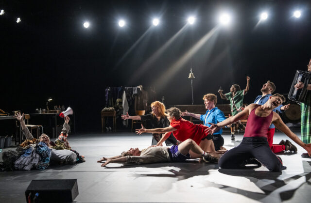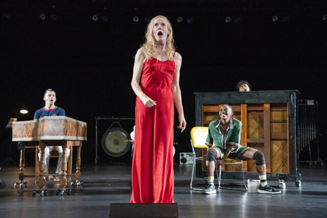 The performers are already congregating on Rosie Elnile’s wide open set as the audience enters the massive Wade Thompson Drill Hall, building a sense of community. On three sides of the neatly arranged platform stage are numerous unmatched chairs, a clothes rack, a few tables, and such instruments as a harp, a gong, a cello, and several pianos on wheels. The show begins with the following declaration, complete with surtitles projected on a small screen hanging from above: