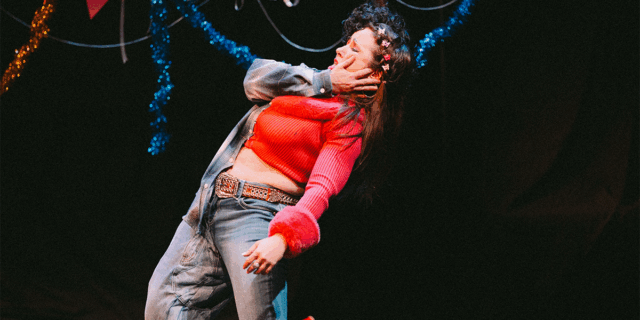 One of my favorite theatrical moments of the year happened in Natalie Palamides’s outrageously funny and insanely inventive Weer. Mark is making a critically important phone call, and I desperately prayed for Christina to quickly return to the stage and answer it. I looked to the far corner, anxiously waiting on the edge of my seat, hoping she would pick it up — when it suddenly hit me that Christina was already there: Weer is a one-woman show in which Palamides is playing both roles, the right side of her body Mark, the left side Christina. Palamides, a trained improv clown, had me believing there were two fully embodied characters in the extraordinary ninety-minute satiric, deranged rom-com like no other. I rejoiced, so thoroughly in love with my reaction.