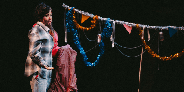 Weer takes place during a New Year’s Eve gathering in 1999, complete with worries that all hell might break loose at midnight, when Y2K threatens to destroy the world. But for ninety minutes, all hell does break loose onstage, as the narrative shifts to 1996, when Mark and Christina meet-cute, and then back to the party, where the couple faces several challenges. Palamides’s awesome costume (by Ashley Dudek) and over-the-top makeup feature a flannel shirt, a bushy mane, a beard and mustache, and chest hair on one side, a belly-revealing red knit top, long hair with colorful clips, jewelry, and a woman’s shoe on the other, positing Mark and Christina as old-fashioned gender stereotypes; he has a deep, gravelly, full-throated voice, while she has a softer, more compassionate tone.