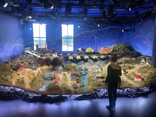 Inside the theater, the seats are arranged in a traditional manner, but the set is like an art installation, a large model of a miniature town with tiny houses, bumpy hills, rocky streets, a river, two bridges, hens near the tracks, and an elevated train station, all surrounded by a map on the walls; in the back are regular-size remnants, an abandoned bicycle and parts of some kind of moving vehicle. In front of the model, a man is projecting slides on an old carousel of costumed men and women — the characters the actors will be portraying. Shortly after the projections stop and the man leaves, we realize that there will be no actors for us to watch; in true radio-play fashion, they will only be heard, prerecorded, but we now know what they look like.