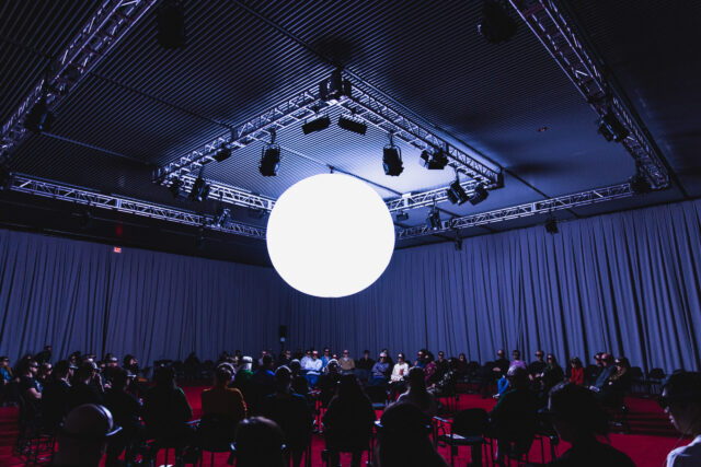The prep for the show is mind-bogglingly annoying. The audience is encouraged to arrive at least fifteen or twenty minutes before showtime in order to check their coats and bags, which is mandatory; however, the line was so long when we go there that we were advised to just bring our stuff in with us. At the Griffin, a sign announced, “wipe your feet / check your glasses / store your shoes / enter through the curtain / find a seat / put on your headset / sit back / enjoy the ride.” There was no curtain; the open doorway revealed a large room with plush red carpeting, a giant glowing orb hanging in the center from the ceiling, and three circular rows of chairs with a pathway through the middle. While my guest waited for corrective lenses — glasses won’t work with the headset — I took off my shoes and jacket, placed them on the floor, and tried to grab a specific seat, then come back and store my garb in one of the small cubby-hole benches, but I was told by a guide that I couldn’t do that; first I had to put the shoes and coat away, then someone would guide me to a chair. The shoes fit in the little cubby, but I had to really force the coat into another slot, only to be told that I had placed them in the wrong bench and had to move them. By then, my guest was already seated — with her jacket, which she was allowed to keep on her lap, and bag, which she could put under her chair.