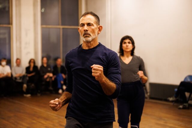 In May 1977, husband-and-wife dancers David Gordon and Valda Setterfield performed their 1975 piece, Times Four in the SoHo loft where they lived and worked. Their son-in-law, Wally Cardona, has brought their little-seen pas d’deux back for a fiftieth-anniversary tribute, teaming up with Molly Lieber to re-create it from a video rehearsal, Setterfield’s handwritten notes, photographs, and other ephemera, taking place in the same loft. It is like a 1960s happening: The limited seating is a single row of folding chairs around the periphery of the otherwise empty room; in addition, the night I attended, there were numerous familiar choreographers and dancers in the audience, all greeting one another. There is no score; the only sounds are Cardona’s (Interventions, The Set Up) and Lieber’s (Rude World, Gloria) breathing and their feet and other body parts touching the floor, sometimes landing softly, sometimes hard. They stare at the walls and windows, rarely making eye contact with the audience, as they glide primarily in unison to four beats, then deleting one move and replacing it with another.