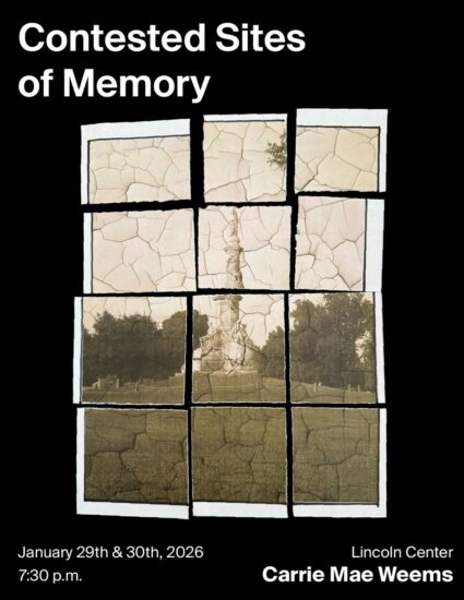 On January 29 and 30, Weems will be at Alice Tully Hall for her latest gathering, “Contested Sites of Memory.” Produced in collaboration with Shore Art Advisory and Lincoln Center, it will feature live music, video art screenings, spoken word, and more, with trombonist, composer, sonic shaman, and musical director Craig Harris, British-born Brooklyn-based playwright, radio host, author, and Armah Institute of Emotional Justice CEO Esther Armah, singer, songwriter, producer, and activist Nona Hendryx, Grammy-winning violinist Jennifer Koh, poet, playwright, novelist, essayist, composer, pianist, professor, and writer Vijay Iyer, and recording artist Carl Hancock Rux, and emcee, trumpeter, composer, producer, educator, and social activist Jawwaad Taylor. The focus is on the purpose and meaning of American monuments and how they relate to the past, present, and future of the country.