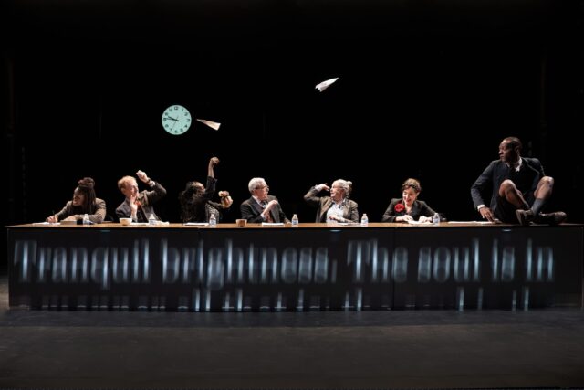 The set, by the collective known as dots, is centered by a long table in the front, where seven actors playing forty characters often sit before getting up and participating in absurdist scenes. A clock on a far wall keeps track of the time, which goes back and forth on Thursday, June 16, 1904, in Dublin. Shepherd and codirector John Collins have trimmed the story down to a lean 165 minutes with intermission; whenever they skip a few sentences, paragraphs, or pages, the words are speedily projected on the table and/or wall, initially accompanied by screeching sounds that eventually calm down a bit as the actors grab on to the table, as if the time jumps have them holding on for dear life.