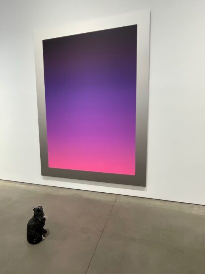 His latest exhibition at 303, today titled “Watching the Sun Set and Drinking Beer with Friends Is the Highest Form of Art” — the name changes every day; it began on January 15 as “Skyscapes” — is another deeply personal show, focusing on the loss of his sister, Gina, who died on December 7, 2025, following a stroke. The works on view include his monthly 2025 “Sunrises” watercolor and silkscreen ink calendar series, ceramic fruit bowls, selections from his “Bright Light” acrylic on linen series, two of his “Suicide Paintings,” and the concrete sculpture Karen, a cat on the floor looking up at Bright Light — Purple.