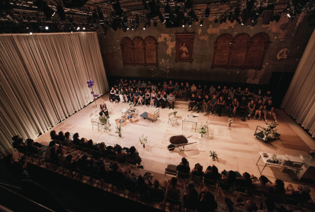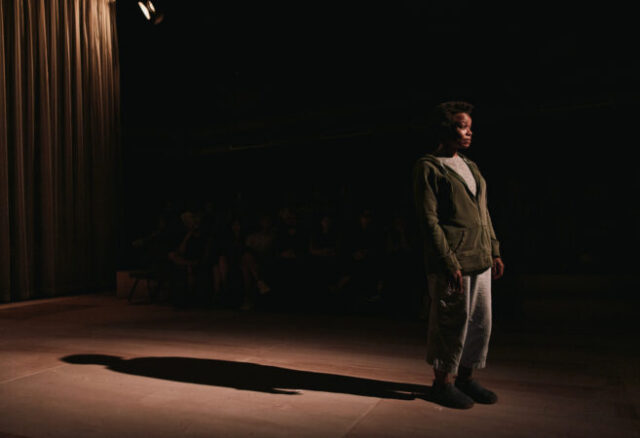 Then Ghanaian American singer-songwriter Moses Sumney, portraying the fool, Feste, walks onto the stage with a guitar and sings, “All the world’s a stage, / And all the men and women merely players. / They have their exits and their entrances, / And one man — or woman — in their time plays many parts.”