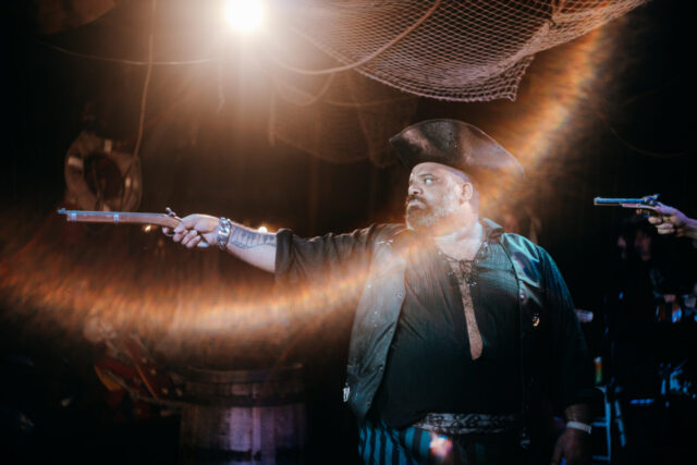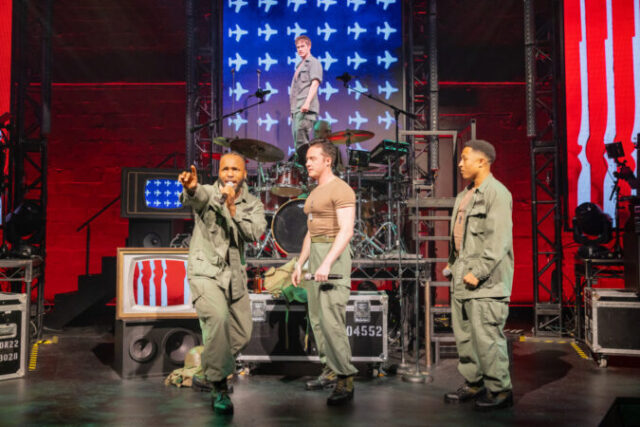 Duke Orsino (Khris Davis) and his minions get ready for action in Twelfth Night (photo by Joan Marcus)