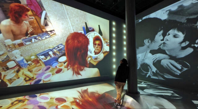 The latest is “Amplified,” which attempts to get to the heart of rock and roll in sixty minutes of photos, videos, colorful designs, and text narrated by Kevin Bacon, leading us through categories dedicated to specific instruments, famous singers, studio work, cars, fashion, concerts, and fandom, among others. More than a thousand photos and two hundred video clips are projected onto three walls and the floor, covering 270º in 18K resolution, bringing us the Who, the Beatles, Miley Cyrus, the Rolling Stones, Patti Smith, Bob Dylan, Beyoncé, the Ramones, Janis Joplin, Bruce Springsteen, Aretha Franklin, David Bowie, Joni Mitchell, Sam Cooke, Karol G, Rico Nasty, Kendrick Lamar, Kiss, Cyndi Lauper, Dr. Dre, Radiohead, Lauryn Hill, AC/DC, Amy Winehouse, Metallica, Siouxsie Sioux, Rage Against the Machine, Ice Spice, Van Halen, Chappell Roan, Jimi Hendrix, et al.